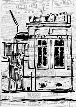 Os traços em nanquim, firmes e contínuos como rios de tinta, evocam permanência e sobriedade. Sobre eles, colagens digitais entrelaçam imagens e recortes de jornais antigos, criando camadas de sentidos onde o passado impresso se dobra ao presente. A sobreposição de fragmentos, manchas e silêncios convoca o olhar a atravessar tempos distintos, numa linguagem em que memória e invenção caminham lado a lado.